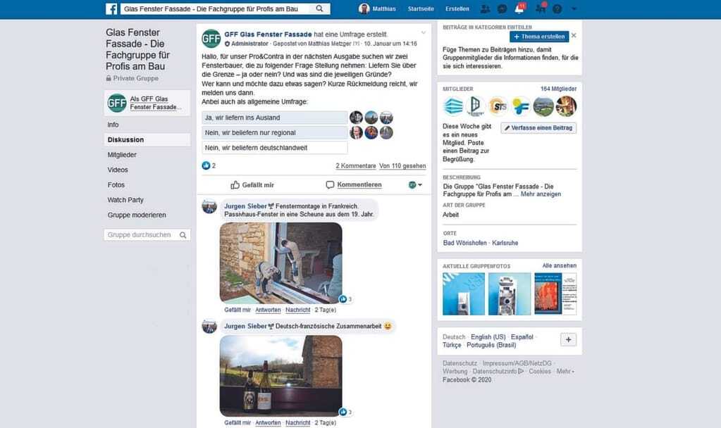 GFF hat auf Facebook die Gruppe „Glas Fenster Fassade – Die Fachgruppe für Profis am Bau“ gegründet. Sie soll Fachleuten in der Glas-, Fenster- und Fassadenbranche als die Plattform für Diskussionen, Fragen und den fachlichen Austausch dienen. Zuletzt wurde etwa auf das Gerichtsurteil eines Oberlandesgerichts aufmerksam gemacht, wonach ein fehlendes CE-Kennzeichen keinen Mangel begründe. Zur Gruppe gelangen Sie über das Facebook-Suchfeld (dort den Gruppennamen eingeben) oder direkt über www.facebook.com/groups/gffdiskutiert. Klicken Sie dort auf "Gruppe beitreten", um Mitglied zu werden. Nach einer kurzen Überprüfung können Sie sofort mitdiskutieren. Mitglied werden kann jeder, der einen Beruf in der Bauelementebranche ausübt. Eine Grundvoraussetzung, um unserem Branchenforum beizutreten, ist es, dass Sie über ein Facebook-Konto verfügen.