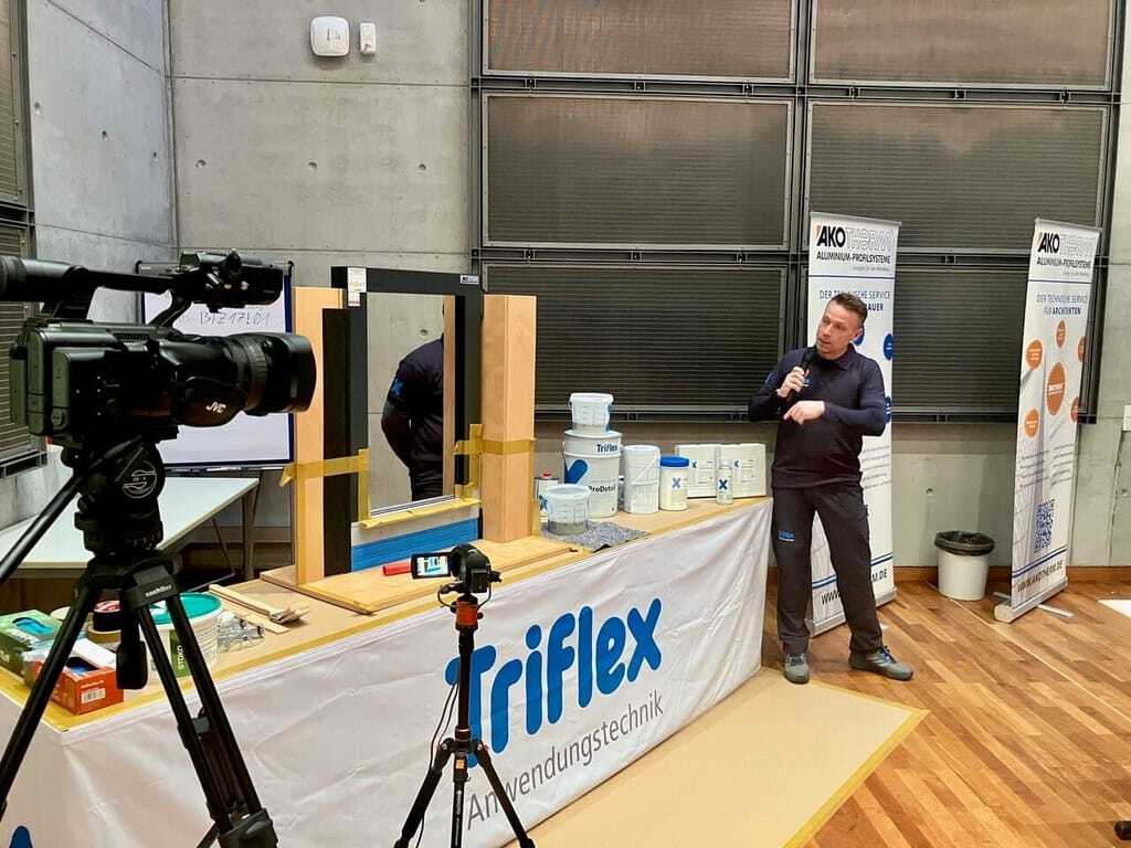 Für die Abdichtung gemäß DIN 18533 hatte Alumat an der Seite des strategischen Partners Triflex mit der Anwendung analog der ift-Richtlinie MO-01 bereits Vorarbeit geleistet. Die Firma Triflex, die auch die Gesamtkonzeption des Forums übernommen hat, bietet mit einer Praxisvorführung ihrer Fachleute für die Anwendungstechnik Torsten Meyer und Maik Neumann ein Highlight an. Die beiden zeigen live, wie barrierefreie Tür- und Fensterelemente fachgerecht abgedichtet werden.