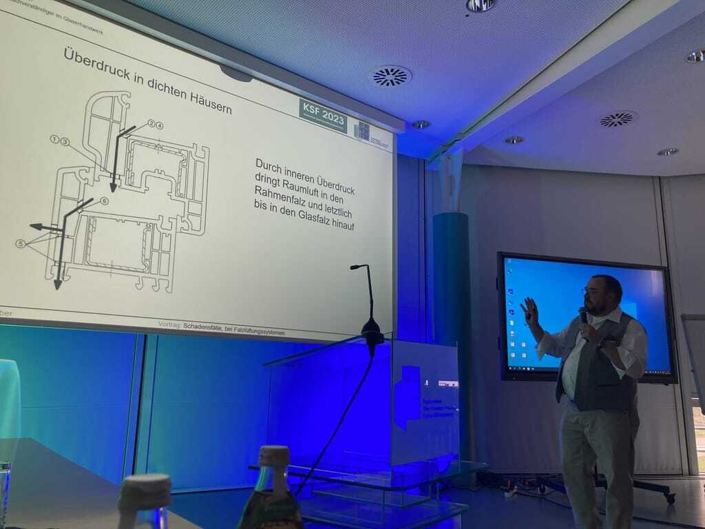 Jürgen Sieber referierte über Schadensfälle bei Fensterfalzlüftern. Er stellte vor, welche Folgen Überdruck in dichten Gebäuden haben kann. Durch inneren Überdruck dringt Raumluft in den Rahmenfalz und letztlich bis in den Glasfalz hinauf, sagte Sieber. In der Praxis seien Schimmelpilzbildung oder Kondensat hinter der Verglasungsdichtung möglich.