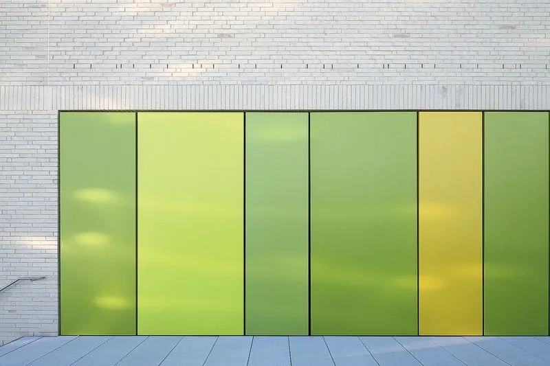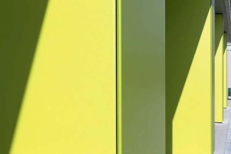 Die Gestaltung der Fassadenflächen resultiert aus der unmittelbaren Umgebung. „Das Farbkonzept der Fassade wurde in mehreren Abstraktionsschritten ganz konkret aus den Farben des Ortes, also dem Kies der Münchner Schotterebene und den Farben der Wiesen und Blumen vor Ort, entwickelt“, beschreiben die Architekten den Gestaltungsansatz und erklären weiter: „Damit haben wir das Haus wie selbstverständlich und unaufgeregt in seine Nachbarschaft eingebunden.“ Sie betonen zudem, dass ihnen der Einsatz wert- und nachhaltiger Materialien wichtig gewesen sei. Roher Sichtbeton, strukturierte, natürlich anmutende Flächen aus Klinker und spiegelnde Glasflächen wechseln sich mit mattgrün, gelb oder silberig schimmernden vertikalen Flächen aus Aluminium ab. Diese metallischen Elemente verteilen sich über die Lernhäuser, akzentuieren Bereiche wie z.B. den Haupteingang und rhythmisieren das Gebäude. HD-Wahl als erfahrener Spezialist für professionelle Oberflächenveredelung von Aluminium-Fassadenbauteilen hat diese in acht verschiedenen NCS-Tönen farbig ausgeführt. Dabei kam eine Duraflon-Nasslack-Einbrennlackierung zum Einsatz. „Duraflon haben wir mit Blick auf die Langlebigkeit sowie wegen des Farbspektrums und der Tiefenwirkung durch den Glimmer gewählt“, erklären die Architekten. Damit bestätigen sie die besonderen Qualitäten – hochwertiger Charakter, Beständigkeit, Nachhaltigkeit bei einer nahezu unbegrenzten Farb- sowie Strukturvielfalt – der Oberflächen von HD Wahl. Trotz der kompakt zurückhaltenden Gebäudeform entstand durch den Einsatz der unterschiedlichen Oberflächeneindrücke eine spannungsvolle und heterogene Außenhaut-Struktur.