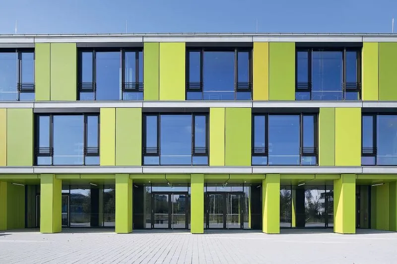 Der Neubau des Gymnasiums im Münchner Stadtteil Trudering integriert sich durch farbige Fassadenflächen aus Aluminium nahtlos in seine Umgebung. Die besondere Beschichtung der metallischen Elemente sorgt für langlebige, hochwertige Farben.