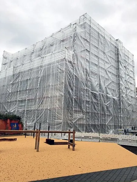 Der Verhüllungscharakter der Fassadenbeheizung mit mobiler Heiztechnik von Heizkurier ähnelt optisch den bekannten Arbeiten des Aktionskünstlers Christo.