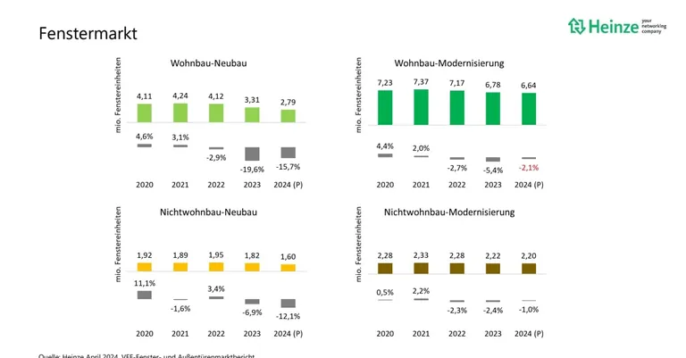 Gemeinsam mit der Heinze Marktforschung werden die Daten vom Verband Fenster + Fassade (VFF), dem Bundesverband Flachglas (BF), pro-K sowie dem Fachverband der Schloss- und Beschlagindustrie (FVSB) erhoben. Wurden in der Vorgängerstudie vom Oktober 2023 noch etwas leichtere Rückgänge für 2024 erwartet, so trübt sich die Markterwartung deutlich ein. Entgegen der bisherigen Erwartung ist schon 2023 die Sanierung insgesamt um 4,7 Prozent deutlicher zurückgegangen als erwartet. Und 2024 wird die Sanierung nochmals, wenn auch nur leicht, um weitere 1,9 Prozent zurückgehen.