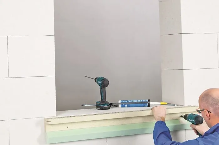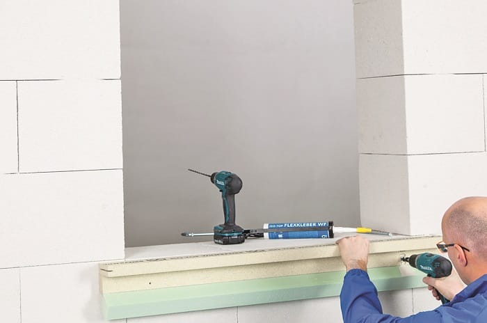 Aufeinander abgestimmte Systemkomponenten bieten dem Verarbeiter im Fall von Iso-Top Winframer Sicherheit bei der Montage von Fenstern vor der Wand. Die Lösung soll Wärmebrücken reduzieren und den Temperaturverlauf in der Anschlussebene des Fensterelements verbessern. Iso-Chemie liefert die Kombination eines tragfähigen Systemwinkels aus dem Material Puratherm mit einem Wärmedämmkern – beide Teile sind per Klappmechanismus miteinander verbunden. Mit einer Kappsäge schneidet der Verarbeiter die Systemwinkel an der Baustelle auf das passende Maß zu. Reststücke verwendet er weiter – für weniger Verschnitt. Es folgt die Verklebung des Systems mit dem Klebstoff Iso-Top Flexkleber WF umlaufend um die Laibung an der Außenwand, danach verschraubt der Betrieb die Komponenten.
