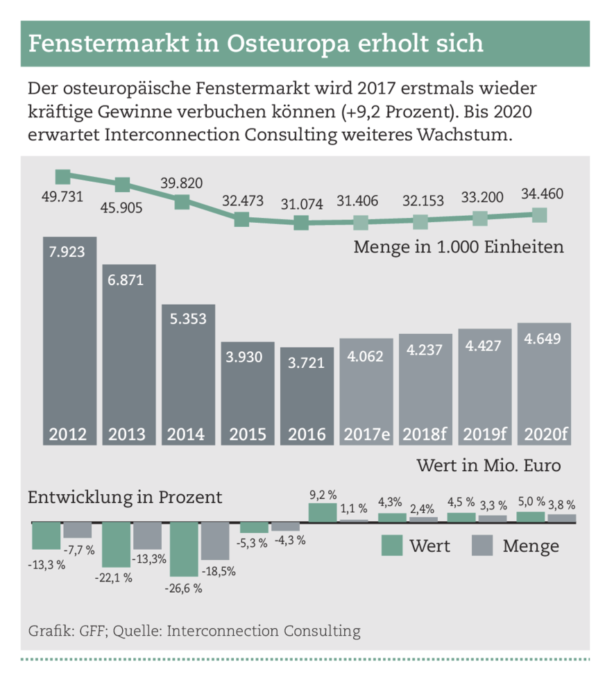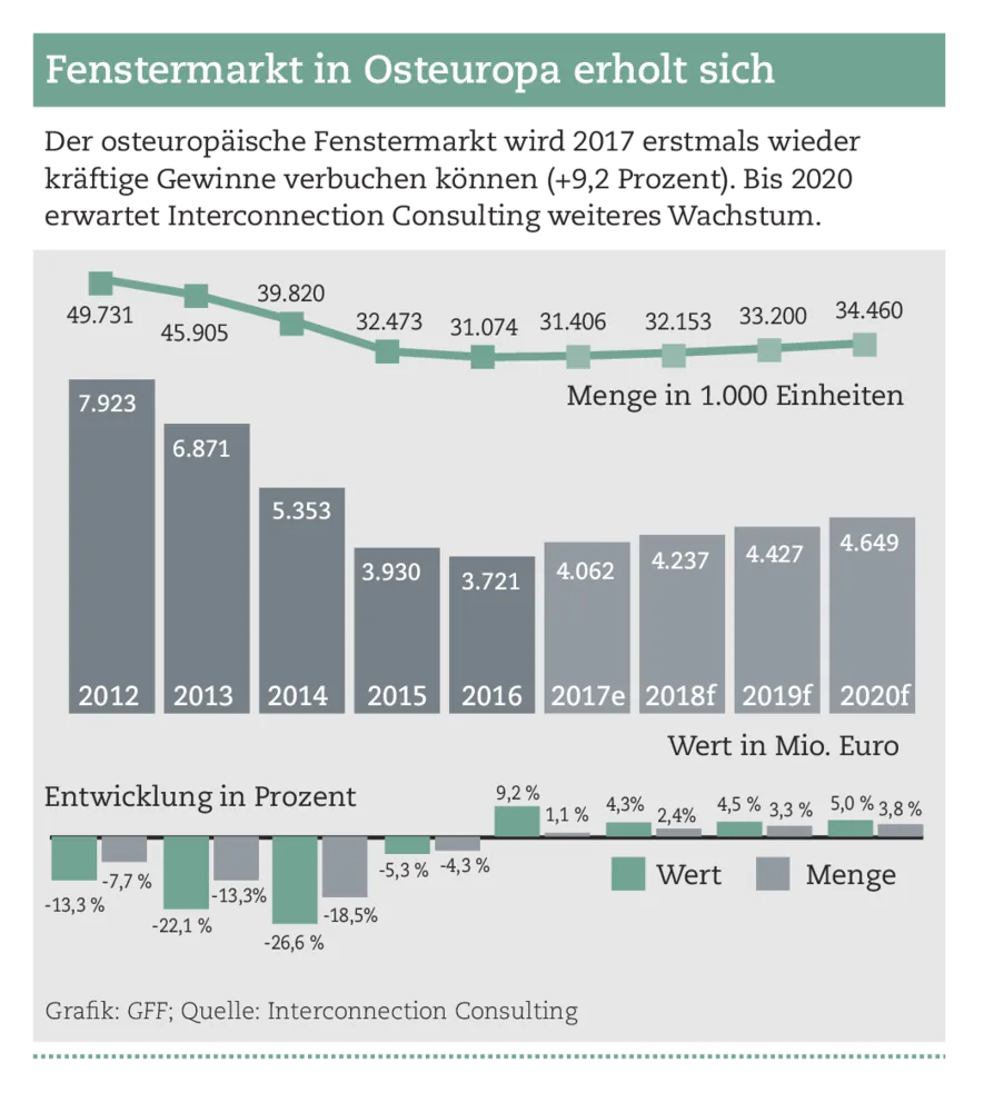 home / Nachrichten / Fenstermarkt in Osteuropa ist zwiegespalten Nachrichten - 8. Dezember 2017 Interconnection Consulting Fenstermarkt in Osteuropa ist zwiegespalten Der Fenstermarkt in Osteuropa ohne Russland und Ukraine stieg im vergangenen Jahr um vier Prozent in der Menge, inklusive Russlands und der Ukraine lag das Gesamtergebnis aber bei minus 4,3 Prozent. - © Grafik: GFF; Quelle: Interconnection keyboard_arrow_left Zurück zur Startseite