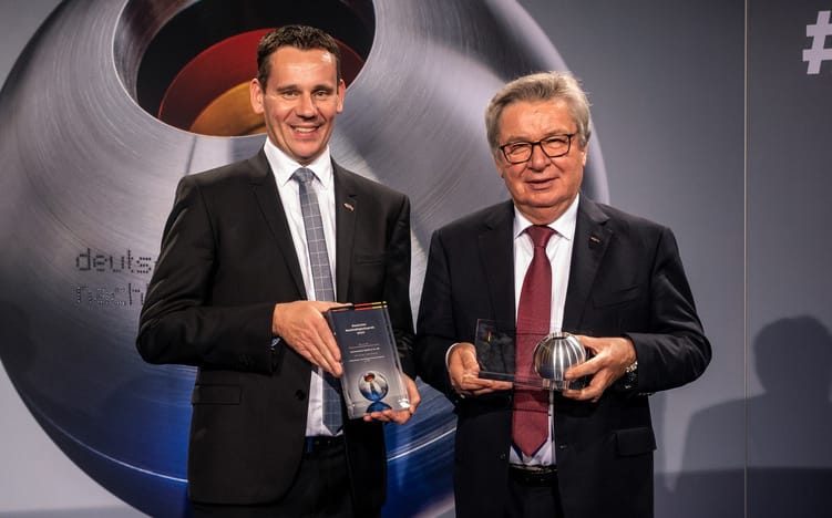 Prof. Klaus Fischer, Inhaber der Unternehmensgruppe Fischer, und Marc-Sven Mengis, Vorsitzender der Geschäftsführung, nach dem Gewinn des Deutschen Nachhaltigkeitspreises. - © Fischer