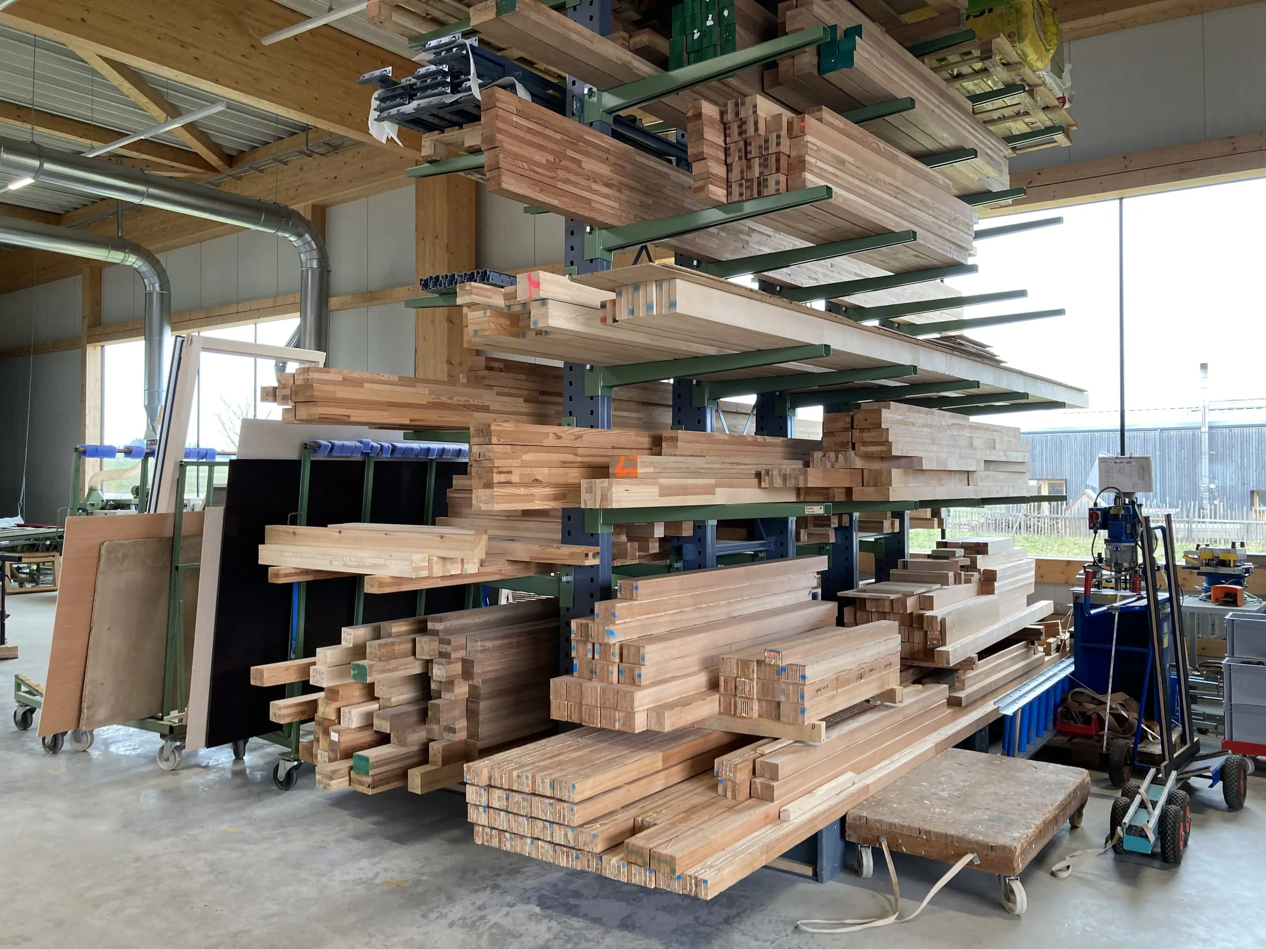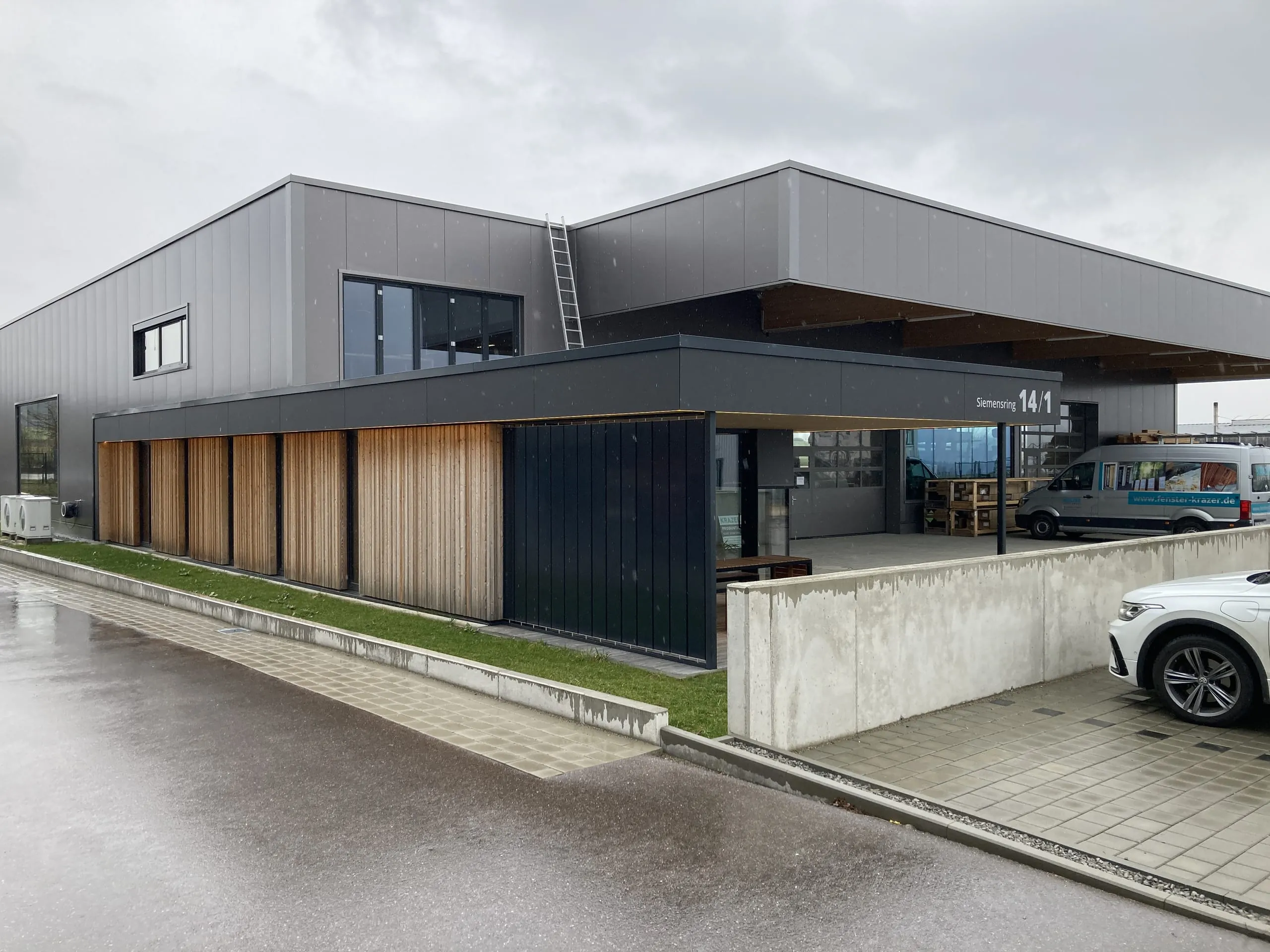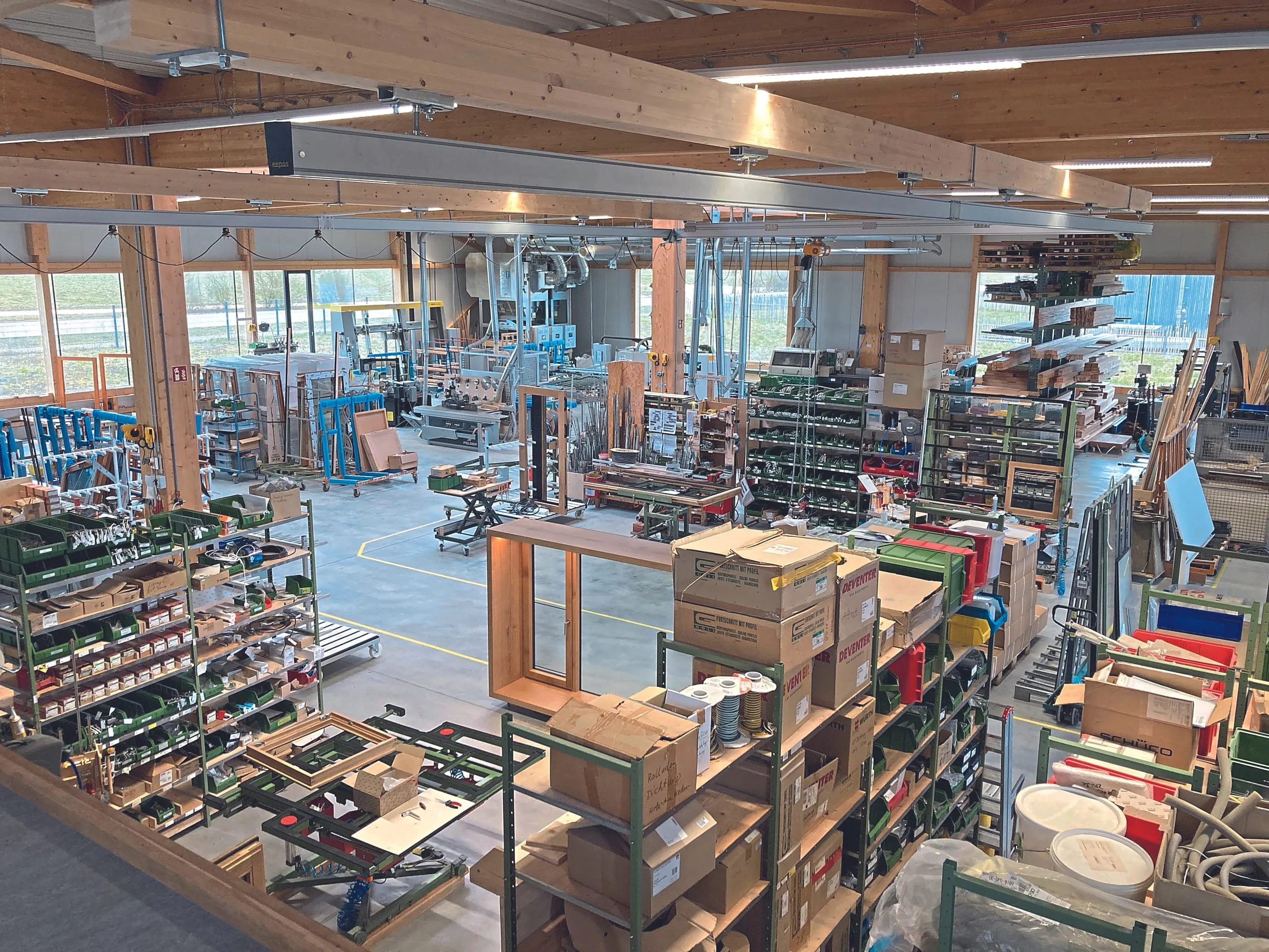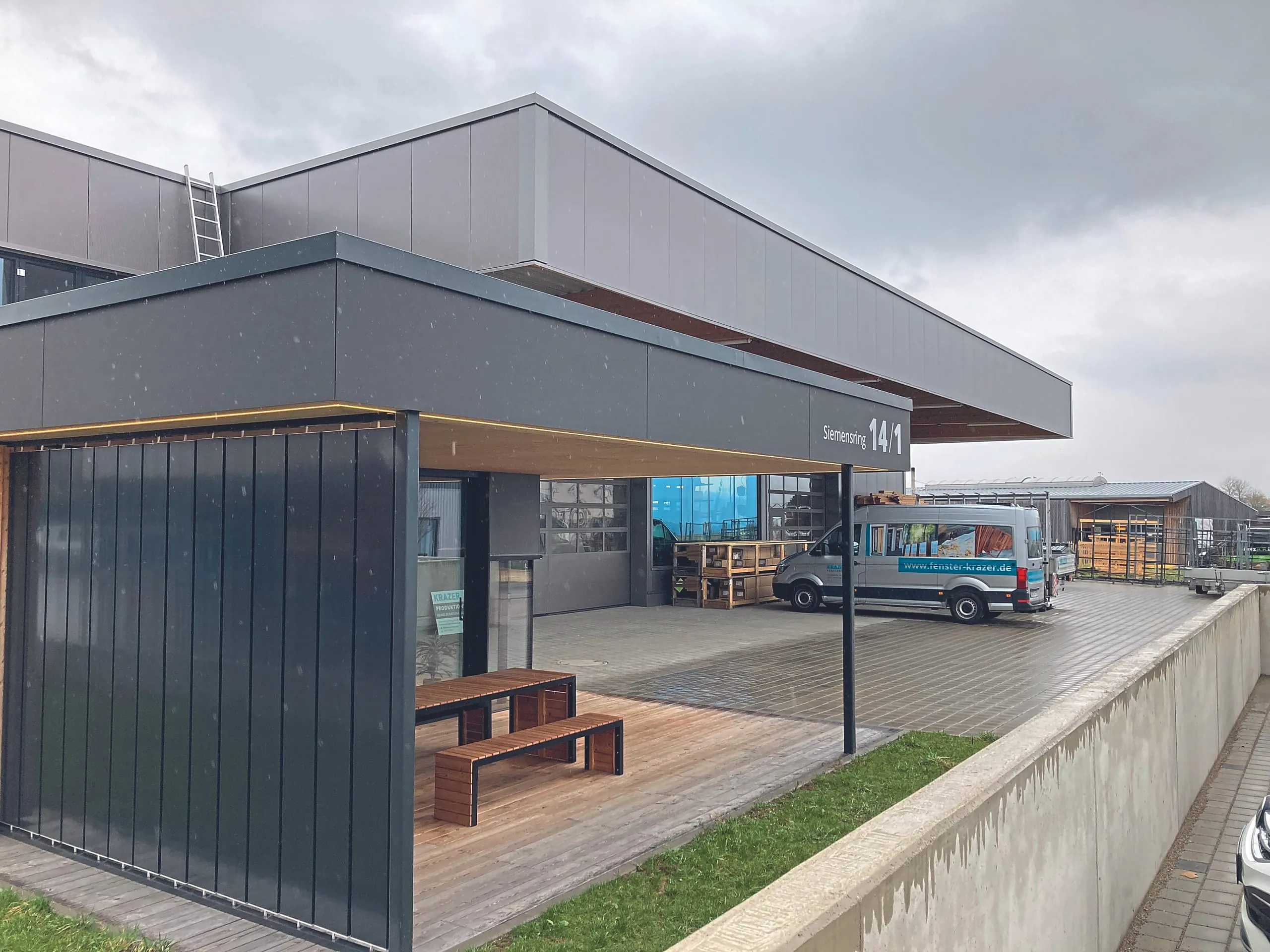 Krazer Fensterbau empfängt seine Kunden und Geschäftspartner in modernen Räumlichkeiten, Ende 2023 ist der Betrieb in einen Neubau umgezogen. Der Neubau mit Büro und Werkstatt liegt in einem Gewerbegebiet und verfügt über den nötigen Platz, um auch großformatige Elemente zu fertigen.
