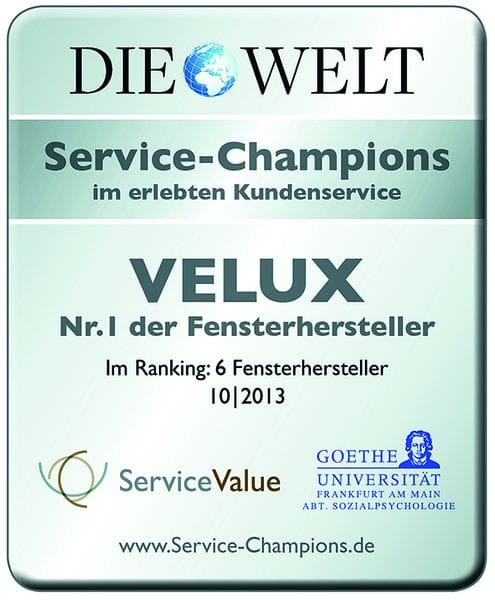 Velux Deutschland hat bei den Service-Champions 2013 als Nummer eins der Branche Fensterbauer abgeschnitten. In der Gesamtwertung von Deutschlands größtem Service-Ranking hat der Dachfensterhersteller den Silber-Rang (Plätze 151 bis 300) erreicht. „Neben Sortimentsbreite und Qualität unserer Produkte ist die Zufriedenheit unserer Kunden für uns von besonderer Wichtigkeit. Deshalb sind wir sehr stolz, dass wir es beim Service-Ranking an die Spitze unserer Branche geschafft haben“, erklärt Velux-Geschäftsführer Dr. Sebastian Dresse. Auch über das gute Abschneiden im Gesamtranking freut er sich: „Die gewonnene Silber-Medaille ist für uns zum einen Bestätigung, aber zugleich auch Motivation, unser Rundum-Paket aus hervorragenden Produkten und zuverlässigem Service noch weiter zu verbessern.“