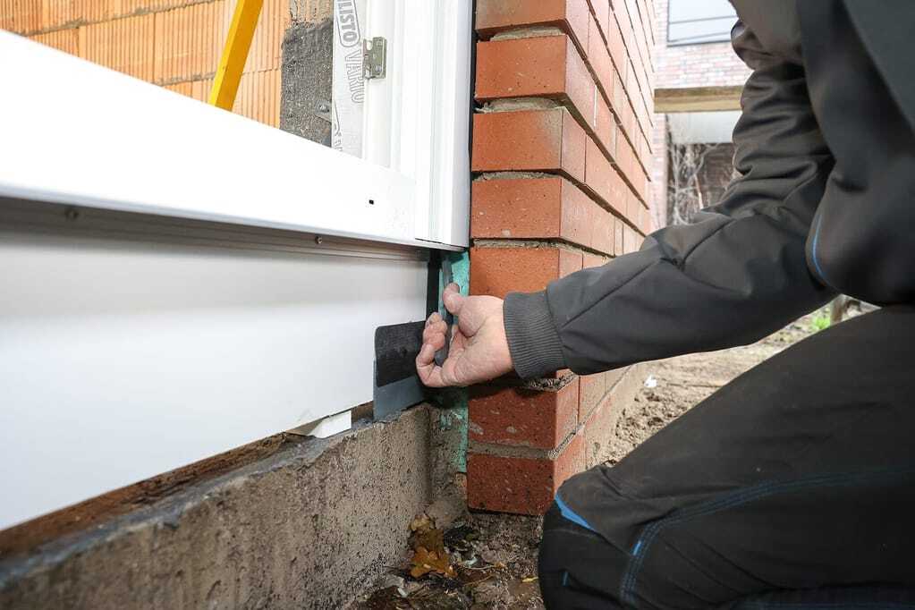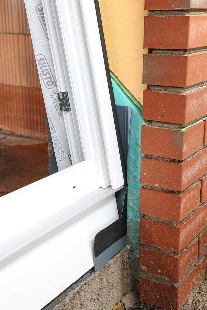 Anschließend wird das Formteil links und rechts in die unteren Ecken der inneren Mauerwerkslaibung positioniert und zusätzlich mit den im Lieferumfang enthaltenen Schraubdübeln fixiert. Nach Herstellerangaben erreicht man damit einen Abdichtungsanschluss, welcher der Wassereinwirkungsklasse W1-E nach DIN 18533-1 entspricht. In die beiden endmontierten Fensterecken werden anschließend die vorgesehenen Türen oder Fenster eingestellt und die restlichen Abdichtungsarbeiten ausgeführt.