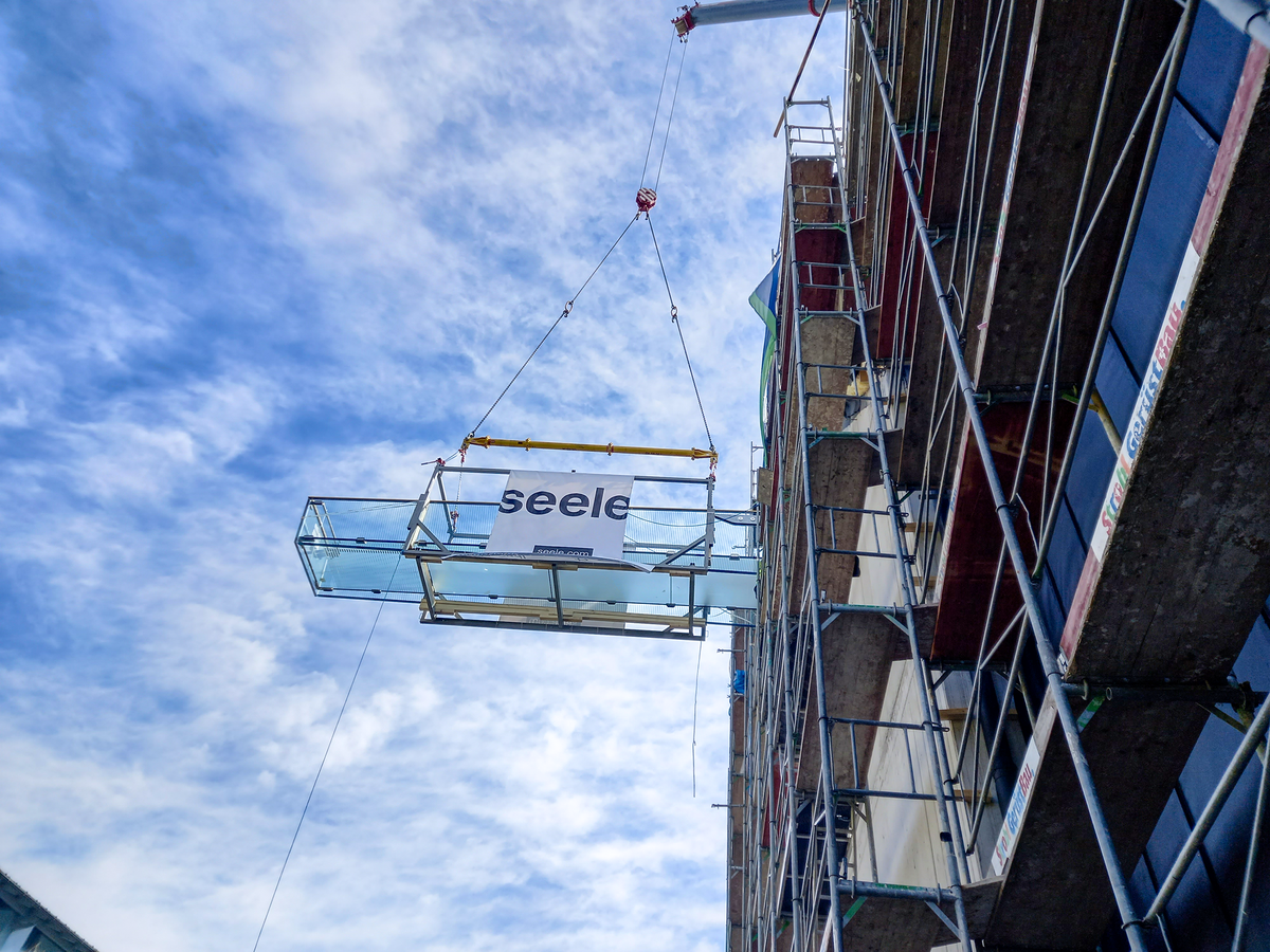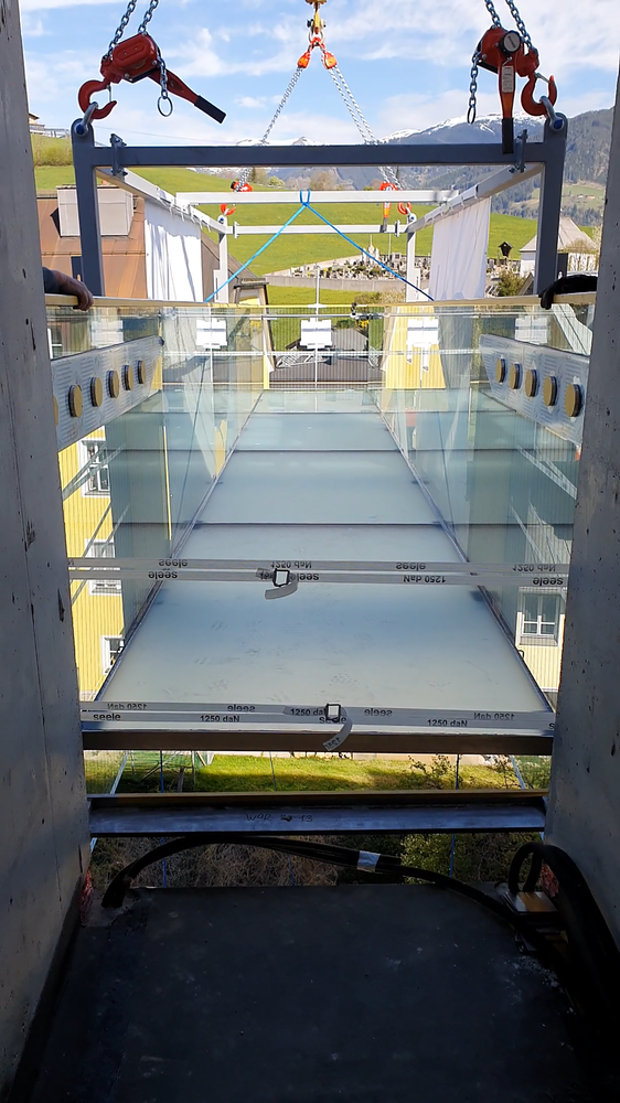 © SeeleDer Glassteg wurde mithilfe eines 45 Meter langen Auslegers über das Bründls Sports-Gebäude zur Einbaustelle im vierten Obergeschoß gehoben.