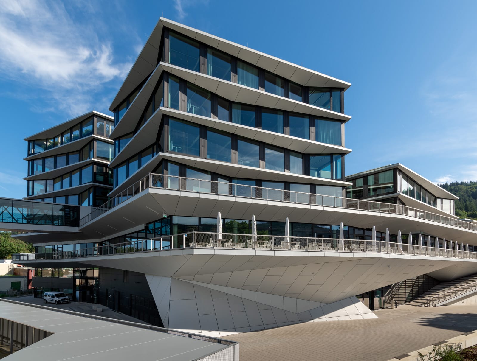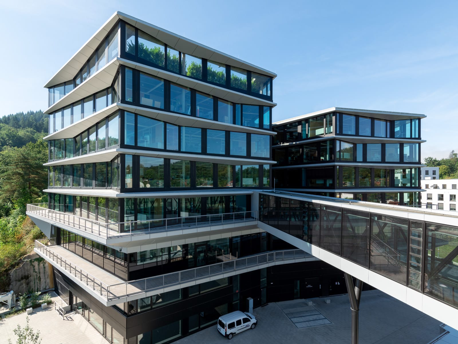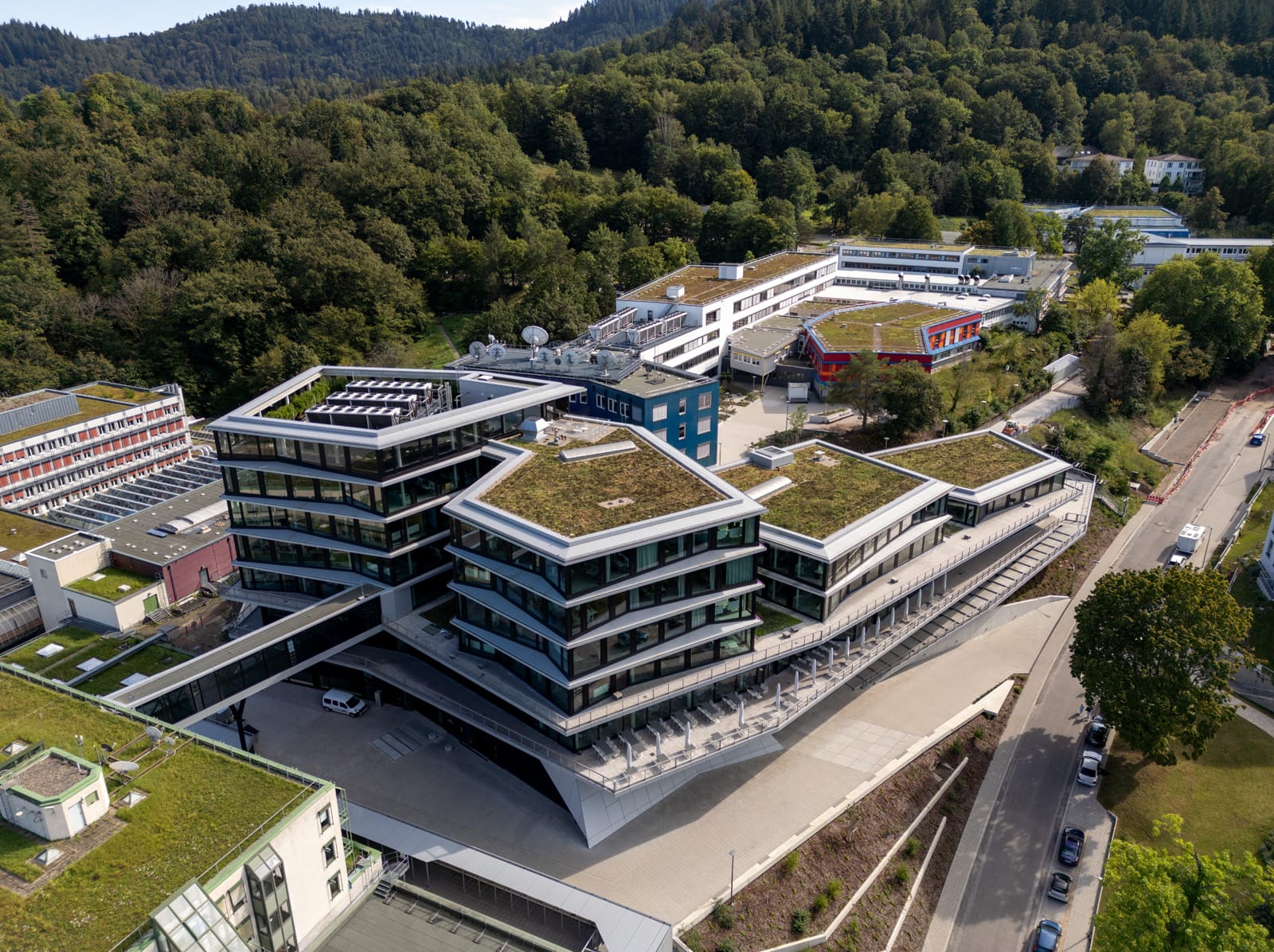 Um der komplexen städtebaulichen und topografischen Situation gerecht zu werden, entwickelten Wurm & Wurm Architekten und Ingenieure aus Bühl vier einzeln gegliederte pavillonartige Gebäude, die in ihrer Höhe gestaffelt sind und mit der oberen Funkhöhe – so wird die Senderzentrale in der Kurstadt genannt - einen Campus bilden.