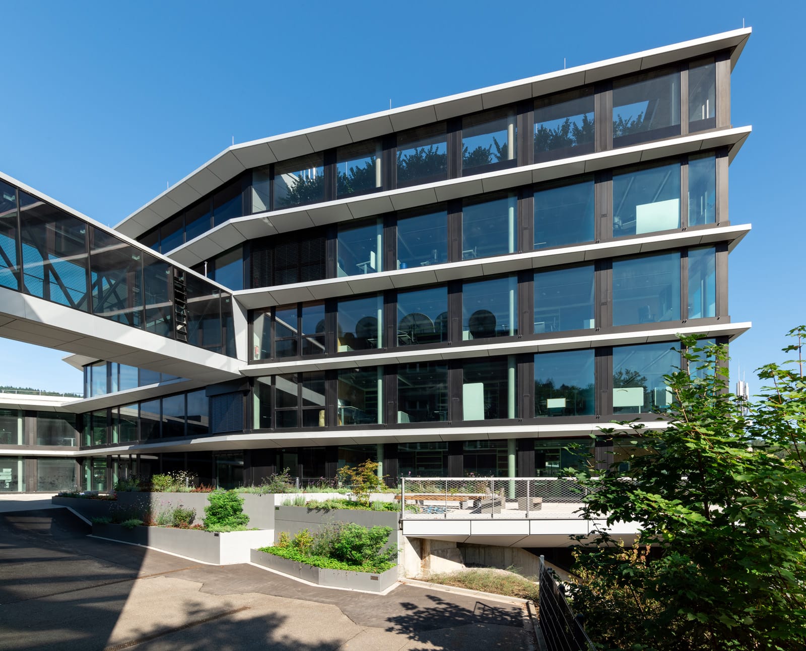 Das Plateaugeschoss definiert die Raumkante zur Hans-Bredow-Straße und öffnet einen Eingang zu den öffentlichen Bereichen des Kasinos, der Cafeteria und der Konferenzräume. Die Arbeitswelten sind in den Pavillons auf dem Plateaugeschoss angeordnet und auf dem Hangrücken aufgefächert.