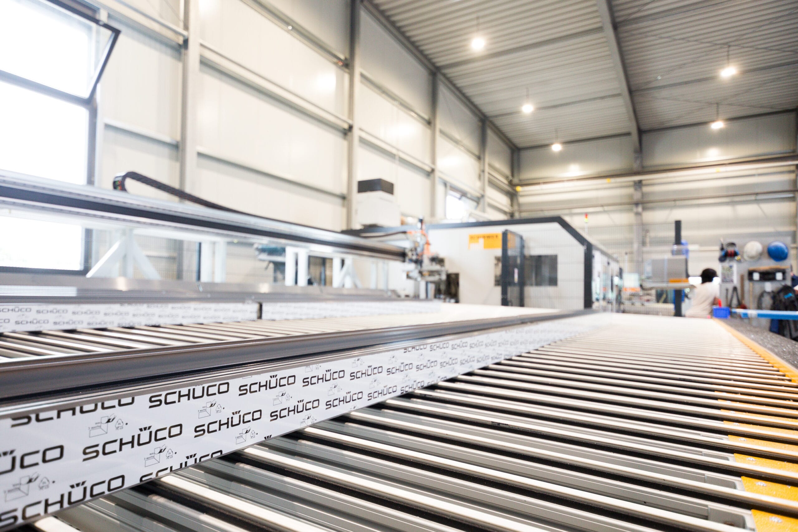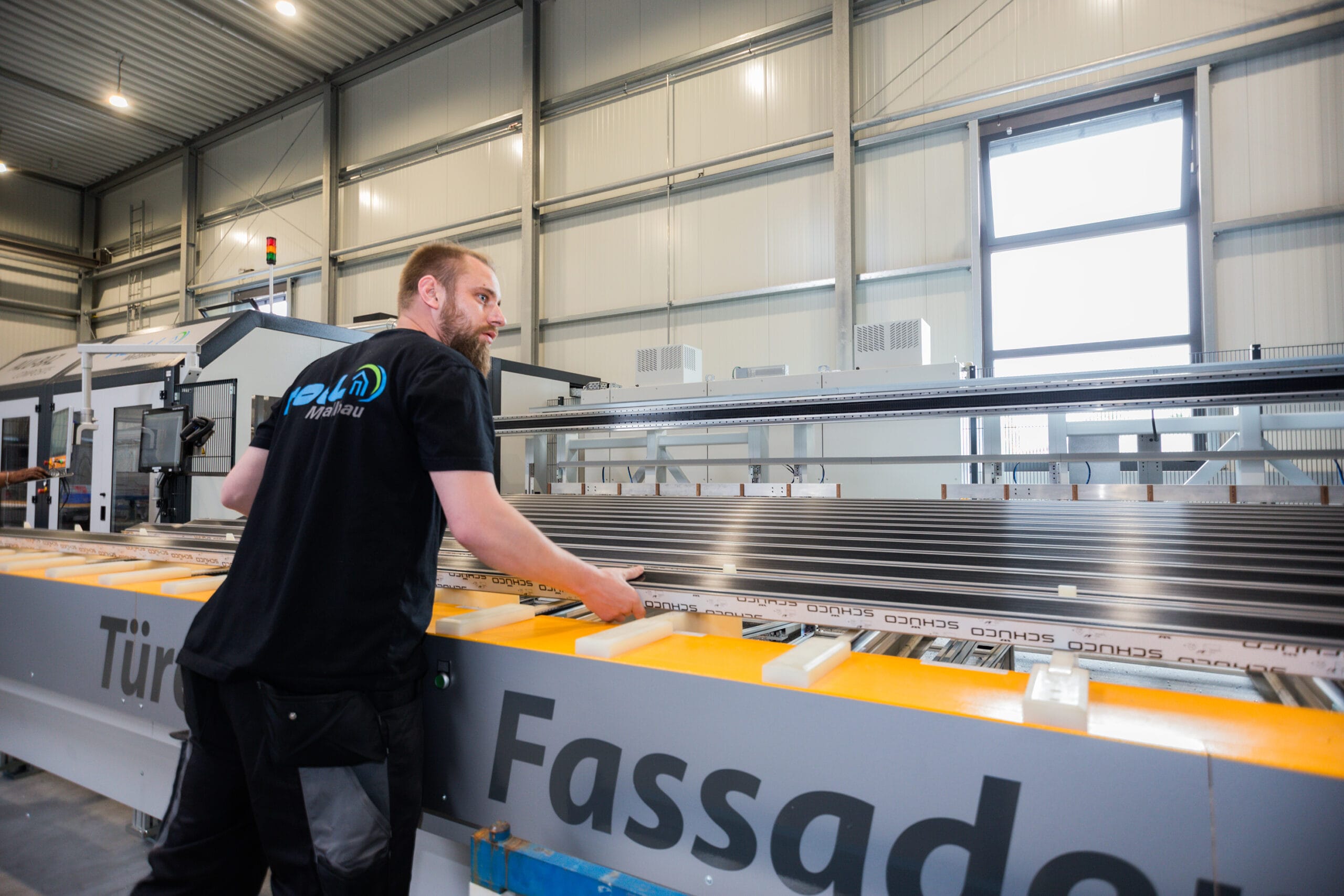 © SchirmerFlexible Beladung mit Schüco-Profilen: Werkstattleiter Matthias Bertram im Einsatz am neuen Alu-Composite-BAZ von Schirmer. -