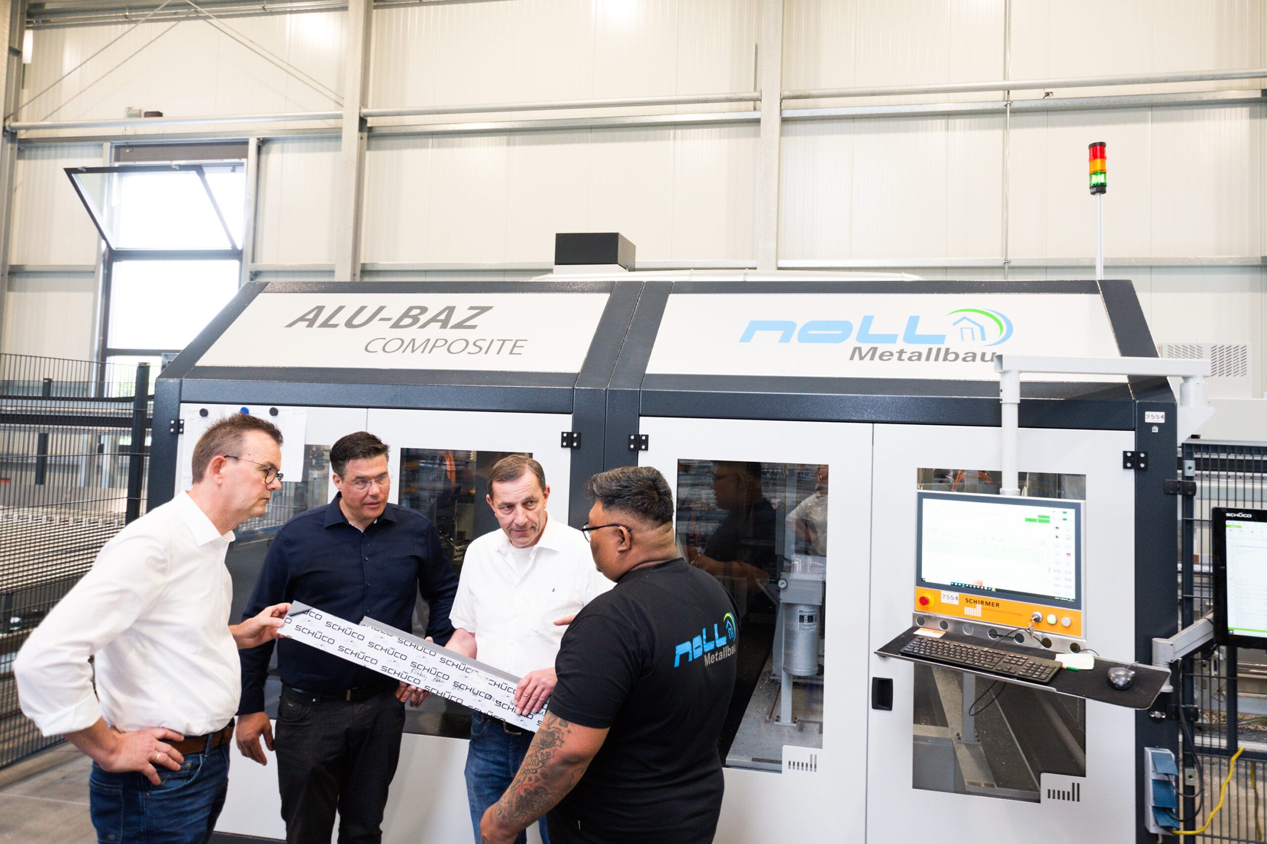 © SchirmerSchirmer-Geschäftsführer Ludger Martinschledde, Noll-Geschäftsführer Markus Noll, Roland Vogt, Mitglied der Schirmer-Geschäftsleitung, und Maschinenbediener Yutthana Blaschke (v. li.) tauschen sich über die Arbeit am und mit dem neuen Alu-Composite-BAZ aus – ein Gewinn für beide Partner.