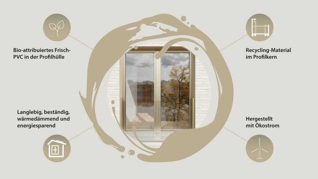 Das Ethylen wird unter Zugabe von Chlor (gewonnen aus Stein- oder Meersalz) zu Vinylchlorid synthetisiert und durch Polymerisation zum Polyvinylchlorid (PVC). Der gesamte Vorgang erfolgt unter Einsatz von Ökostrom. Im Vergleich zu konventionell erzeugtem PVC werden so laut zertifiziertem Lieferanten zirka 90 Prozent CO2 eingespart bei unveränderten technischen Eigenschaften des Materials. Dieses bio-attribuierte PVC ist ISCC PLUS-zertifiziert und massenbilanziert – und läuft ebenso wie konventionelles Frisch-PVC in die Profilproduktion ein.