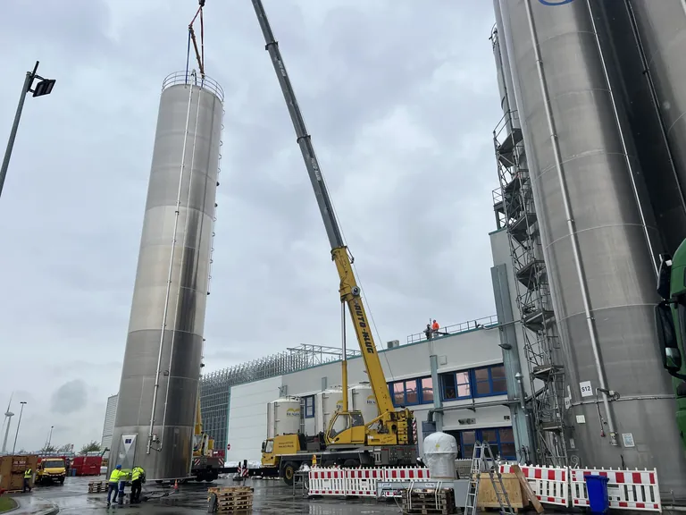 Schweres Gerät war kürzlich am Gealan-Produktions- und Logistikstandort Tanna im Einsatz: Mit zwei Kränen wurde am Standort-Eingang weithin sichtbar ein neues Silo aufgestellt.