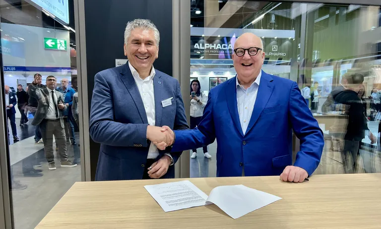 Ivica Maurović, Sprecher der Gealan-Geschäftsführung, und Martin Meesenburg, Inhaber und Geschäftsführer der gleichnamigen Gruppe, unterzeichneten den Kooperationsvertrag auf dem Messestand von Gealan. - © Gealan