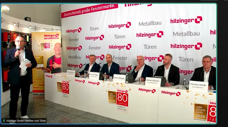 Gaben die Unternehmensnachfolge sowie Geschäftszahlen für 2025 bekannt: (v.re.) Christian Bandle, Roman, Helmut und Armin Hilzinger sowie Martin Kurzka. Links Moderator und Marketingleiter Harald Schmidt. - © Screenshot: HMM