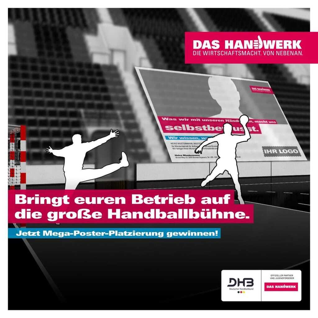 Als offizieller DHB-Partner verlost Das Handwerk zwei Werbeplätze auf einem Mega-Poster an Handwerksbetriebe. Die Teilnahme an der Auslosung ist für Betriebe ganz einfach: Im Werbeportal des deutschen Handwerks unter werbeportal.handwerk.de anmelden oder bei Erstnutzung registrieren. Anschließend das Aktionsmotiv „Was wir mit unseren Händen tun, macht uns…“ im Plakat-Konfigurator mit einem von 17 passenden Adjektiven (z.B. „selbstbewusst“ oder „kreativ“) sowie mit einem eigenen Bild, dem Betriebslogo, der Adresse und einem kleinen Beschreibungstext individualisieren und herunterladen sowie den Teilnahmebedingungen zustimmen. Die Teilnahme ist pro Betrieb einmalig bis zum 20.6.2021 möglich.