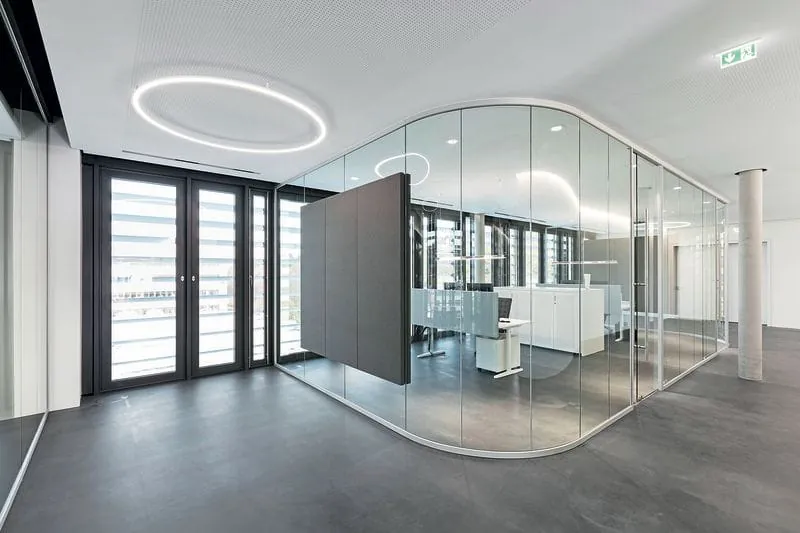 Die Nurglas-Konstruktion Fecoplan von der Feco-Federle GmbH, einem Systemtrennwandhersteller in Karlsruhe, unterstützt diese transparente Wirkung. Die als offene Bürolandschaft konzipierte Arbeitsumgebung gliedern eingestellte Glaskörper. Die zum Teil gebogenen Glaswände scheinen in das Raumgefüge förmlich hineinzufließen. Die Türen sind als beidseitig wandbündige Holz-Türelemente mit verdeckt liegenden Türzargen und Bändern ausgeführt.
