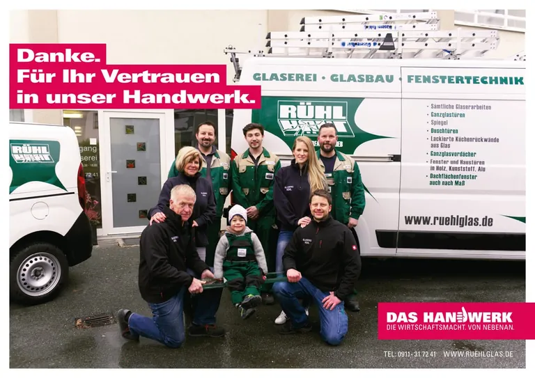 Wenn die Glaserei Rühl in diesen Tagen mit Großflächenplakaten rund um den Betriebsstandort in Nürnberg wirbt, bekennt sie sich zu ihrer Leidenschaft für das Handwerk und tut dies im Design der bundesweiten Imagekampagne des Handwerks.