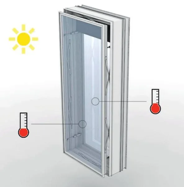 Mithilfe verschiedener technischer Tricks versuchen Architekten schon seit Langem, der Überhitzung von Innenräumen den Kampf anzusagen: Standardlösungen sind Sonnenschutzlamellen oder -rollos. Da diese jedoch vor Wind geschützt werden müssen, ist in diesen Fällen eine zweite, vorgelagerte Glasscheibe erforderlich. Die Doppelverglasung hat zur Folge, dass ein Luftraum zwischen den Scheiben entsteht, der sich schnell aufheizt und der die Wärme an den Innenraum abgibt, der dann wiederum gekühlt werden muss. Zumeist sind doppelt verglaste Hochhäuser daher mit Lüftungsschlitzen ausgestattet. Um diese bei Kälte oder Sturm schließen zu können, sind eine ausgetüftelte Sensorik und kleine Elektromotoren erforderlich. Die Signalverarbeitung läuft dann über die zentrale Haustechnik.