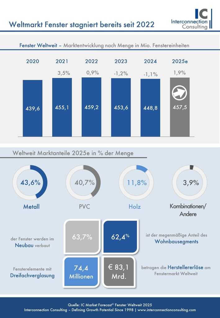 Der weltweite Fenstermarkt erreichte im Jahr 2024 ein Volumen von 448,8 Millionen Einheiten, was einem Rückgang von 1,1 Prozent entspricht. Die Herstellererlöse gingen um 1,7 Prozent auf 81,1 Milliarden Euro zurück. Diese Zahlen gehen aus einer aktuellen Studie von Interconnection Consulting hervor.