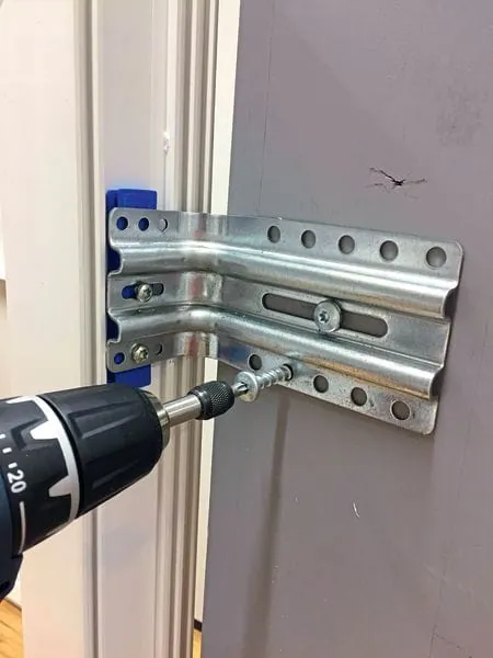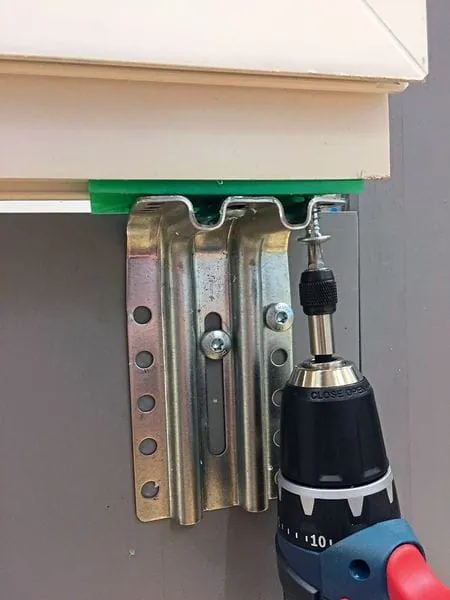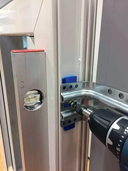 4. Schritt: Setzen Sie den Blendrahmen an der vorgesehenen Position auf die unteren Montagewinkel und richten Sie ihn in der Senkrechten aus. Anschließend erfolgt die Verschraubung des Winkels mit dem Blendrahmen.