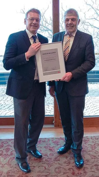 Rolf Haffelder (li.), Segmentverkaufsleiter Handel bei Sika Deutschland, übergibt Helmut Münnich, dem Geschäftsführer von A. Brickwedde, die Auszeichnung Händler des Jahres. - © Sika Deutschland GmbH