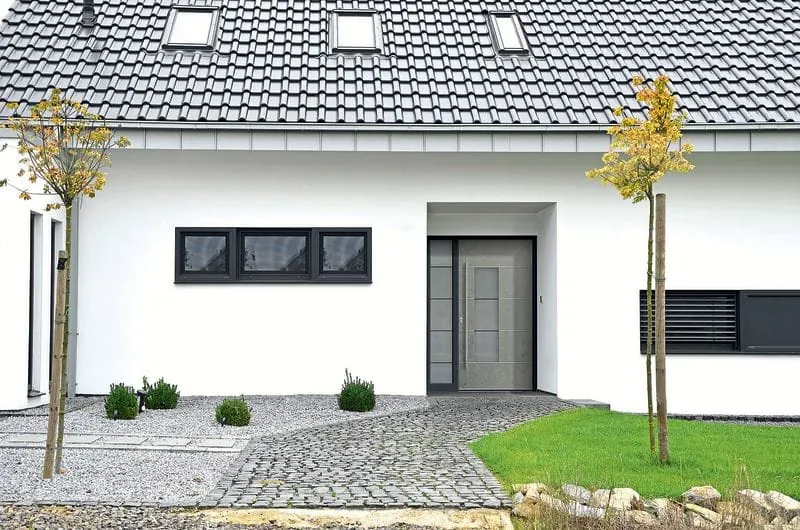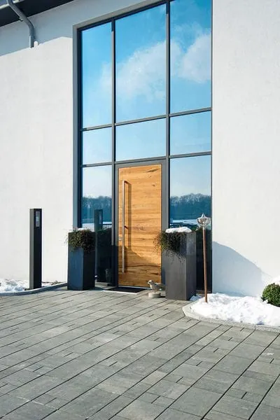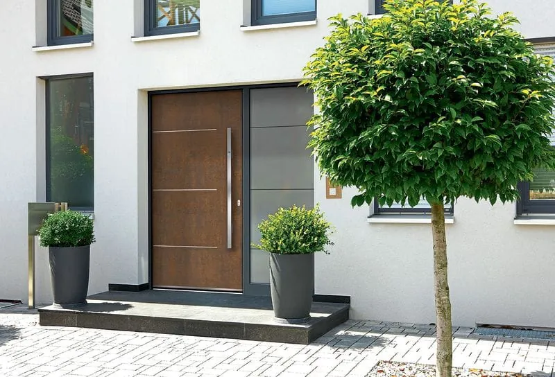 Ein Blickfang sind auch die Aluminium-Haustüren mit Keramikoberfläche in den Varianten Art-Corten, Art-Steel und Art-Stone. Diese sind ihren Originalen Corten-Stahl, Stahl und Stein sowohl optisch als auch haptisch nachempfunden. Die Ausführungen Art-Corten und Art-Steel vermitteln urbanes Flair. Art-Stone weist eine mineralisch wirkende Oberfläche auf. Die Serie Naturart Keramik ist für die Haustür-Modelle Locarno und Neuenburg, beide mit sandgestrahltem Glas und Applikationen in Edelstahloptik, sowie für die Modelle Frauenfeld und Olten mit geometrisch gestalteten Edelstahl-Lisenen erhältlich.