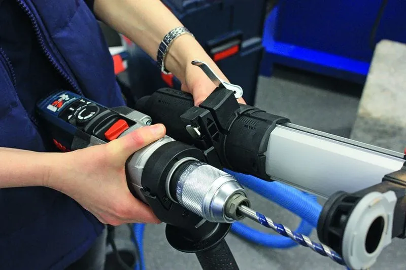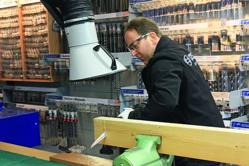 Eine Hand umklammert den Basisgriff des Schlagbohrers, die andere hält den Arm der aufgesetzten Absauganlage. Im Würgegriff setze ich die Maschine mit dem Metallbohrkopf am Mauerwerk an und entfessle mit einem dosierten Fingerdruck eine Geräuschorgie: „Brrrghh“, „bamm, bamm, bamm“, so frisst sich der Bohrer durch die Wand; und es spritzt – nichts! Keine Reste des Steins oder Staub fliegen durch die Luft. Diese Partikel hat die Staubabsaugung GDE 16 Cyl Professional sauber in den angeschlossenen Zylinder gebannt. Per Alu-Teleskopführung und Schnellspannhebel an der Schlagbohrmaschine montiert, deckt die Sauglösung Bohrdurchmesser von vier bis 16 Millimeter sowie Lochsägen und Hohlbohrkronen bis 82 Millimeter mit allen gängigen Staubsaugern ab. So bohren Handwerker schnell in die Wand und hinterlassen ihren Kunden weder Staub noch Dreck.