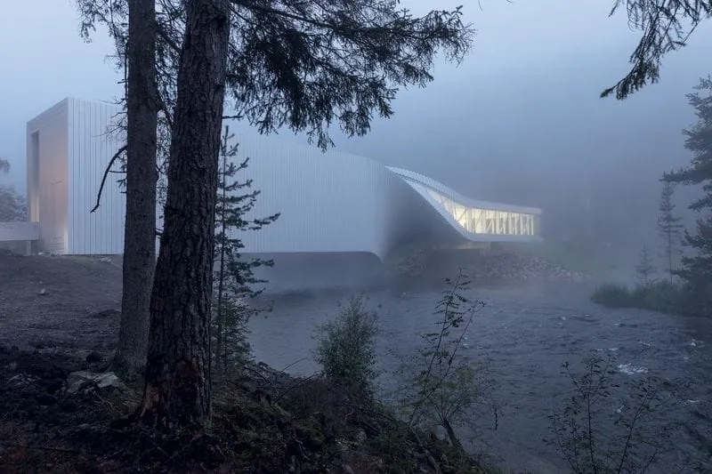 Mitten in einem Waldgebiet liegt das Kistefos Museum in Norwegen. Für die Fassade musste Saint-Gobain frei geformte Scheiben unterschiedlicher Größen realisieren.