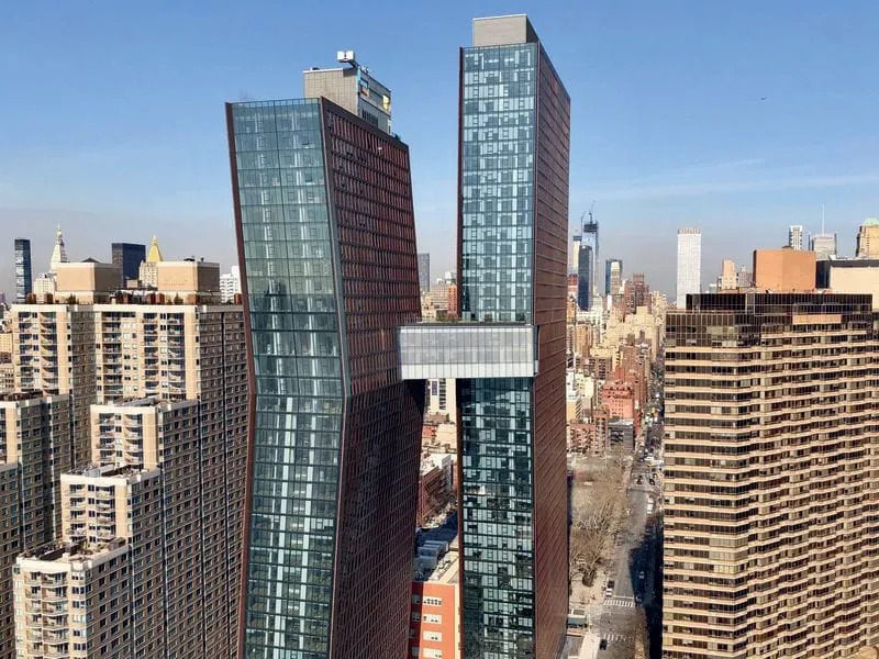 Tanzende Zwillingstürme in New York: Eine Skybridge von Glas Trösch, u.a. mit Pool und Fitnesstudio, verbindet das Duo auf einer Höhe von 100 Metern.