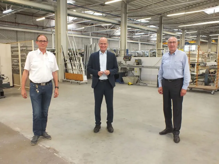 Nach der Begrüßung und einem Produktionsrundgang gab es Diskussionsbedarf. Zentrales Thema war die künftige Klimaschutzpolitik. In diesem Zusammenhang erwähnte Ralph Brinkhaus, dass ein großes CO₂-Einsparungspotential im Gebäudesektor liegt. Eine umfangreiche Sanierungsoffensive darf erwartet werden, bei der auch eine große Anzahl an neuen Fenstern erforderlich ist, zumal viele der aktuellen Fenster im Gebäudebestand sich auf einem energetisch veralteten Stand befinden.