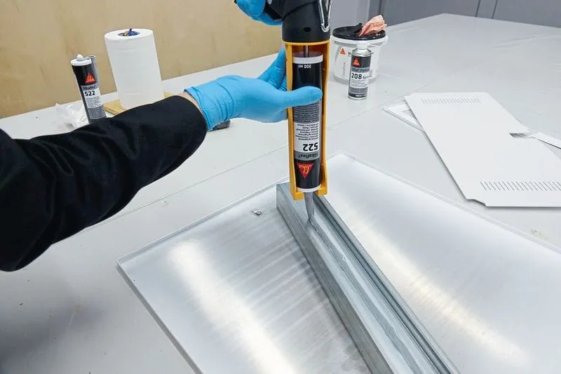 Schimmelresistent und geeignet für Abdichtungsanwendungen im Klima- und Lüftungsbau: die Applikation von Sikaflex-522 im Klebetest