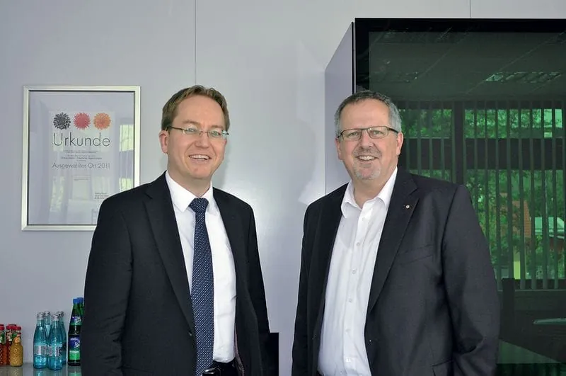 Mit Reinhold Kober von GFF sprach Hans-Joachim Arnold (re.) über die Gründe für seinen Entschluss und darüber, wie die Gruppe Sonnenschutzglas neu erfand.
