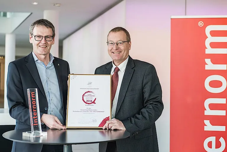 Internorm-Geschäftsführer Johann Brandstetter und Werner Beutelmeyer vom Market-Institut bei der Übergabe der Auszeichnung. - © Internorm