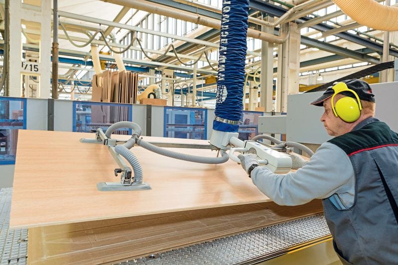 Für die Modernisierung von CNC-Bearbeitungszentren zeigt J. Schmalz das Vakuum-Aufspannsystem Innospann. Damit lässt sich jedes CNC-Bearbeitungszentrum, unabhängig von Hersteller und Typ, nachrüsten. So kann der Maschinentisch – bei Fertigung in Losgröße eins oder bei häufigem Produktwechsel – einfach und schnell umgerüstet werden. Vakuumheber vereinfachen Transport- und Handhabungsvorgänge in der Produktion. Mit dem Vakuum-Schlauchheber JumboErgo werden sperrige und schwere Holzplatten, Zuschnitte oder Möbelelemente komfortabel und ergonomisch transportiert. Der Griff ist einem Motorrad-Gasgriff nachempfunden. So lassen sich die Werkstücke feinfühlig und zielgenau bewegen. Beispielsweise für das Bestücken von Vertikalsägen verfügt der JumboErgo über eine 90-Grad-Schwenkfunktion. Für die Handhabung von Fenstern, Glasscheiben und -bauteilen zeigt Schmalz den Vakuumheber VacuMaster Window. Er ermöglicht einen beschädigungsfreien Transport von Lasten bis 500 Kilogramm. Der Anwender kann beispielsweise Fenster vertikal umsetzen und per Knopfdruck am Bedienelement um 360 Grad drehen und um 90 Grad schwenken. Die Vakuum-Erzeugung ist auf Wunsch mit Luft-sparfunktion erhältlich. Mit ihr senkt der Anwender den Energieverbrauch deutlich. Die verwendeten Saugplatten des VacuMaster Window sind UV- und ozonbeständig und hinterlassen keine sichtbaren Abdrücke auf empfindlichen Oberflächen.