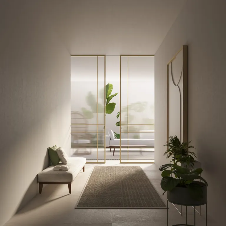 Für mehr Industrial-Look lassen sich die Glastüren der MET-Loft-Serie auch mit Sprossen gestalten. Dieses außergewöhnlich reduzierte Türblatt ist verbaut im bewährten System MET, das die Türzarge im Mauerwerk verschwinden lässt.