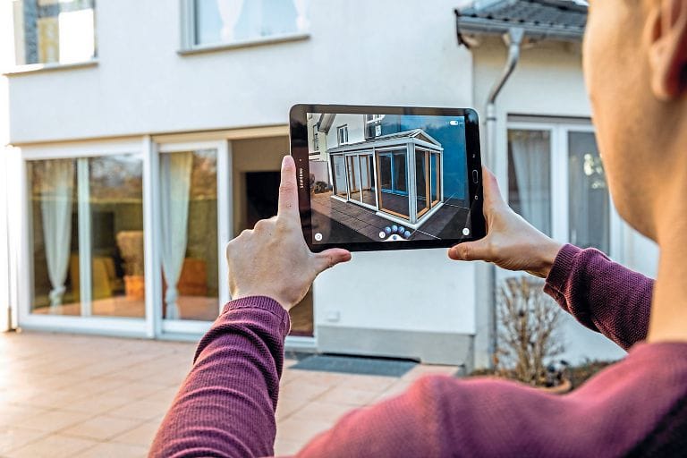 Mit Klaes 3D verarbeiten Kunden neben Fassaden und Wintergärten in allen Materialarten mittlerweile auch frei stehende Pergola-Systeme, Terrassenüberdachungen, Vordächer, Dachgauben, Ganzglas-Schiebeanlagen, Geländer oder auch Zaunanlagen. Damit Kunden die komplexen Bauelemente in der Verkaufsphase lebensecht am Objekt präsentieren können, zeigt Klaes auf der Bau erstmals eine Lösung für Augmented Reality (AR). Mit dem Tool lassen sich vor Ort z.B. Wintergärten virtuell an ein Haus stellen. Die Visualisierung wird dabei auf einem handelsüblichen Tablet oder Smartphone angezeigt. Der Nutzer könne sich auch im virtuellen Wintergarten umschauen, die Knotenpunkte mit allen Details begutachten und sogar durch die Scheiben auf den Garten blicken.