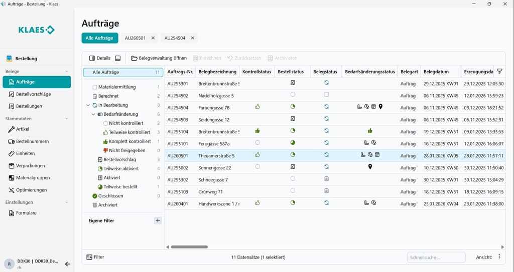 Im Bereich Einkauf zeigt Klaes zahlreiche Weiterentwicklungen. Eine modernisierte Oberfläche, die zentrale Verwaltung von Stammdaten und Lieferanten sowie flexible Auswertungen bilden die Grundlage. Neu ist unter anderem die automatische Erkennung von Bedarfsänderungen, die nachträgliche Anpassungen transparent sichtbar und gezielt prüfbar macht. Das Kontrollcenter bietet eine positionsgenaue Übersicht über Bestellvorschläge und Bestellungen – inklusive klarer Statuslogik, Filtermöglichkeiten und vollständiger Nachvollziehbarkeit. Auch die Artikelstammdaten steuert Klaes über strukturierte Freigabeprozesse.