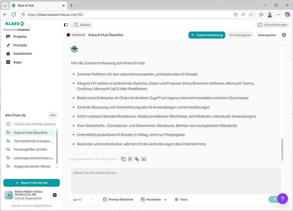 Mit seinem KI Hub stellt Klaes eine zentrale Plattform für den Einsatz von Künstlicher Intelligenz (KI) vor. Anders als isolierte KI-Werkzeuge sei der KI Hub als Management- und Steuerungsplattform konzipiert, in der sich sämtliche KI-Anwendungen bündeln und kontrolliert einsetzen lassen. Der Fokus liege auf der Praxis: Die KI arbeite direkt mit vorhandenen Daten und Systemen – darunter die Klaes-Branchensoftware, Microsoft Teams, Onedrive und Microsoft 365-E-Mail-Postfächer. So entstünden nachvollziehbare, kontextbezogene Ergebnisse statt allgemeiner Antworten ohne Bezug zum eigenen Betrieb.