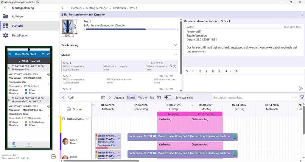 Auch die Montage digitalisiert Klaes konsequent: Montage Connect – WinDo Flow verbindet die Klaes-Montageplanung nahtlos mit einer mobilen Montage-App für Monteure vor Ort. Alle relevanten Informationen fließen direkt aus der Planung in die App und stehen in Echtzeit bereit. Rückmeldungen von der Baustelle gelangen direkt ins System zurück und erhöhen Transparenz sowie Planungssicherheit. Klaes übernehme Support und Koordination und setze auf zukunftssichere Schnittstellentechnologien.