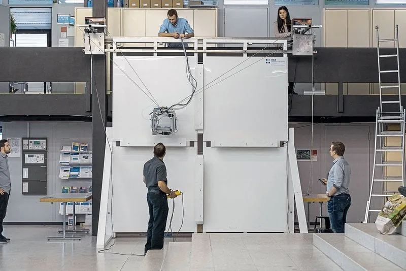 Der Roboter saugt sich an der nachgebauten Fassade fest.