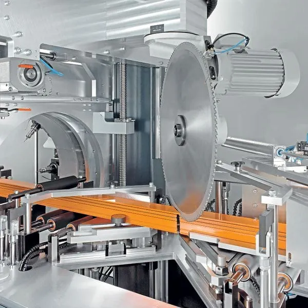Das Zuschnittaggregat von SBZ 628 S besteht aus einem Zweiachs-Sägeaggregat mit einer Antriebsleistung von fünfeinhalb Kilowatt. Damit trennen Verarbeiter maximale Profilquerschnitte von 200 mal 160 Millimeter oder 160 mal 200 Millimeter, wobei Trennschnitte zwischen 45 und 135 Grad möglich seien. Während des Vorgangs fixieren Plattenspanner die Profile. Den störungsfreien Profiltransport gewährleisten absenkbare Tischplatten. Beim Profilaustransport werde das Material schonend behandelt. Das Spannsystem bringt die Außengreifer schon beim Zuschnitt in Position. Diese legen dann die bearbeiteten Profile auf dem Außentransportband ab. Dieser Prozess ermögliche eine kontrollierte Übergabe zu jeder Zeit. Er sichere auch ein definiertes Ausziehen von kürzesten Längen.