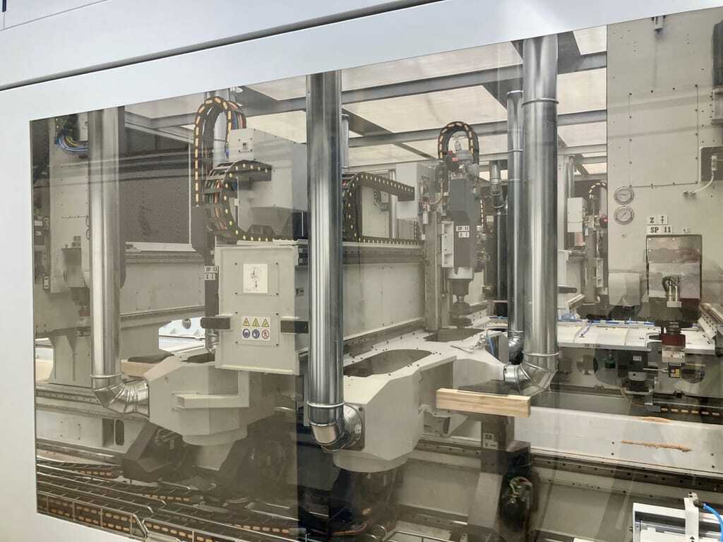 Das Herzstück bildet ein Hochleistungs-Bearbeitungszentrum, das alle sechs Seiten der Werkstücke simultan in doppelter Querbearbeitung inklusive Eckverbindungen bearbeitet. Stirnseitig führt es Konter- und Bohrarbeiten aus, längsseitig Profilierungen, Nuten, Einsatzfräsungen und Bohrungen. Zusätzlich bohrt und fräst die Maschine von oben und unten.