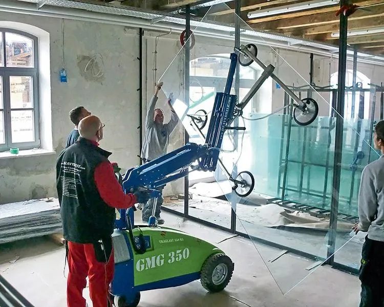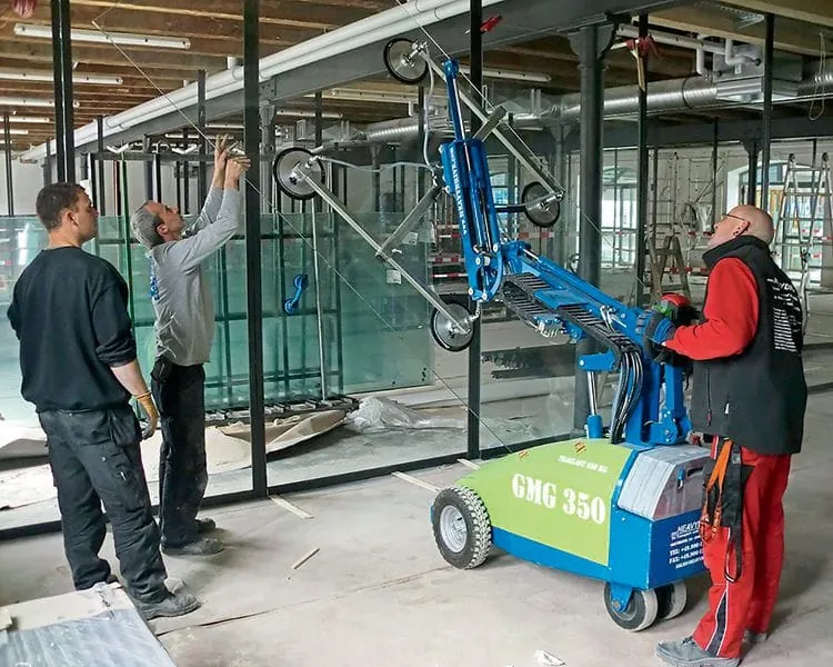 Der Spezialist für anspruchsvolle Glasmontage-Situationen ist die Firma Heavydrive: Sie bietet eine Fülle von Geräten zum Transport und Einbau großer, schwerer Scheiben und die Beratung, wie sich herausfordernde Aufgaben vor Ort lösen lassen. Beim Neubau und bei der Montage von außen ist die Lage meist komfortabel: Auf großen freien Flächen können die Geräte wie Montagekräne oder Vakuum-Sauganlagen gut eingesetzt werden. Aber auch für komplizierte Glasmontage-Situationen im Innenbereich findet das Team von Heavydrive die richtigen Lösungen. „Logistik ist unser Geschäft“, sagt Geschäftsführer Günter Übelacker und erklärt, dass die Spezialisten zunächst die Problemsituation analysieren und dann den Kunden beraten. Zu klärende Fragen lauten dabei: Wie zugänglich ist der Innenbereich? Ist die vorhandene Deckenlast ausreichend, um die Montage-Geräte und die Scheiben zu tragen? Wie wird das Glas vor Ort angeliefert? Ist ein Material-/Lastenaufzug vorhanden und nutzbar? Wie ist der Untergrund beschaffen? Muss man ihn schützen, gibt es beispielsweise Doppelböden? Und: Welche Glasmaße mit welchem Gewicht sind zu transportieren und einzubauen? Auf der Basis aller dieser Informationen erarbeitet Heavydrive die optimale, effizienteste Montagelösung. Zum Einsatz kommen die passenden, emissionsfreien und daher selbst für den Innenbereich geeigneten Geräte.