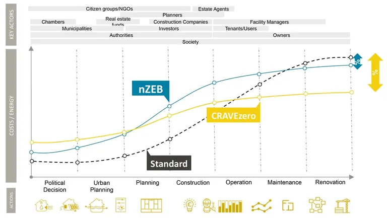 Ab 2021 sind Niedrigstenergiegebäude (nZEBs) im Neubau in Europa Standard. Dies schreibt die EU-Richtlinie zur Gesamtenergieeffizienz von Gebäuden (2018/844) vor. Gebäudeplaner, Architekten und Bauwirtschaft sind dann gefordert, kostenoptimierte Gebäude mit minimalem Energiebedarf zu realisieren. Einige Planungsbüros bzw. Bauträger haben langjährige Erfahrungen mit Niedrigstenergiegebäuden gesammelt. Sie haben sich mit Forschungsinstitutionen in dem internationalen Projekt CraveZero zusammengeschlossen, um ihr Wissen der gesamten Baubranche zur Verfügung zu stellen. Der Fokus liegt dabei auf mehrgeschossigen Wohnungs- und Bürogebäuden in Europa.