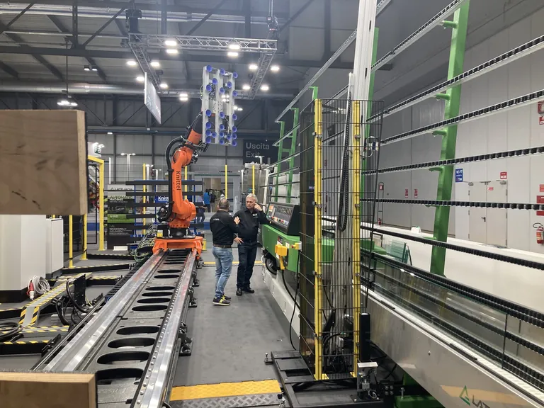 Dieser bewegt sich auf einer sogenannten siebten Achse vor der Schleifmaschine hin und her und sorgt für das automatische Be- und Entladen des Glases. Auf der Vitrum präsentieren Lattuada und Knittel ein Beispiel dieser Roboterlinie. Darüber hinaus zeigte man mehrere Kantenschleifmaschinen.