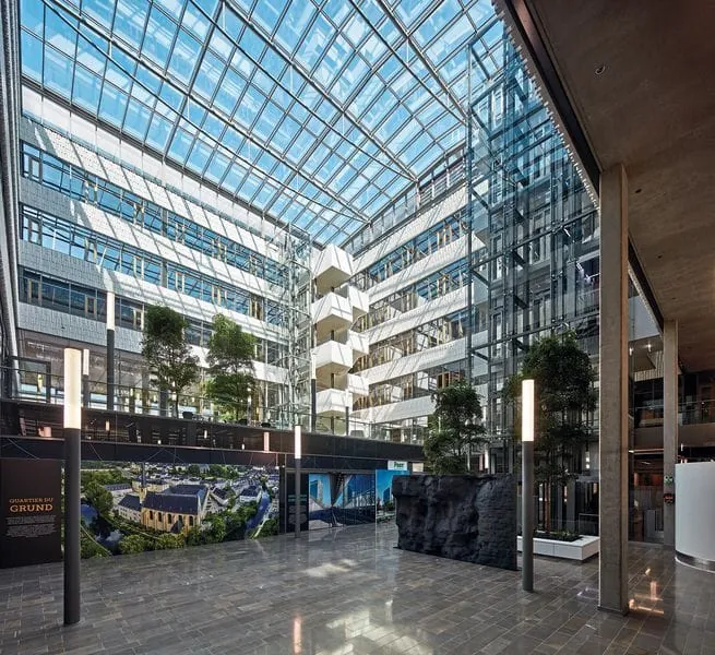 Lamilux hat mit dem Abstandhalter Swisspacer Ultimate die Glasdachkonstruktion im von der DGNB mit Platin zertifizierten Neubau der Post Luxembourg realisiert. Als Passivhaus-System muss ein geneigtes Glasdach einen Wärmedurchgangskoeffizienten von weniger als 1,0 W/m²K aufweisen. Das Lamilux CI-System PR60 Energysave erreicht mit dem Abstandhalter von Swisspacer einen Ucwi-Wert von 0,81 W/m²K. Um Tauwasser und Schimmelgefahr zu vermeiden, sind zudem ein fRsi-Wert von mindestens 0,7 und eine Temperatur an der Innenseite der äußeren Scheibe von mindestens 12,8 Grad Celsius gefordert. Auf zwischen 14,3 und 17,1 Grad Celsius und einen fRsi-Wert von 0,78 bzw. besser kommt das Tageslichtsystem beim bâtiment Mercier. „Solche Werte erreichen wir nur mit dem speziellen Aufbau unseres Lamilux CI-Systems, unserem Dichtungsprofil und dem Abstandhalter von Swisspacer“, betont Manuel Sörgel, Projektleiter Glasarchitektur bei Lamilux.